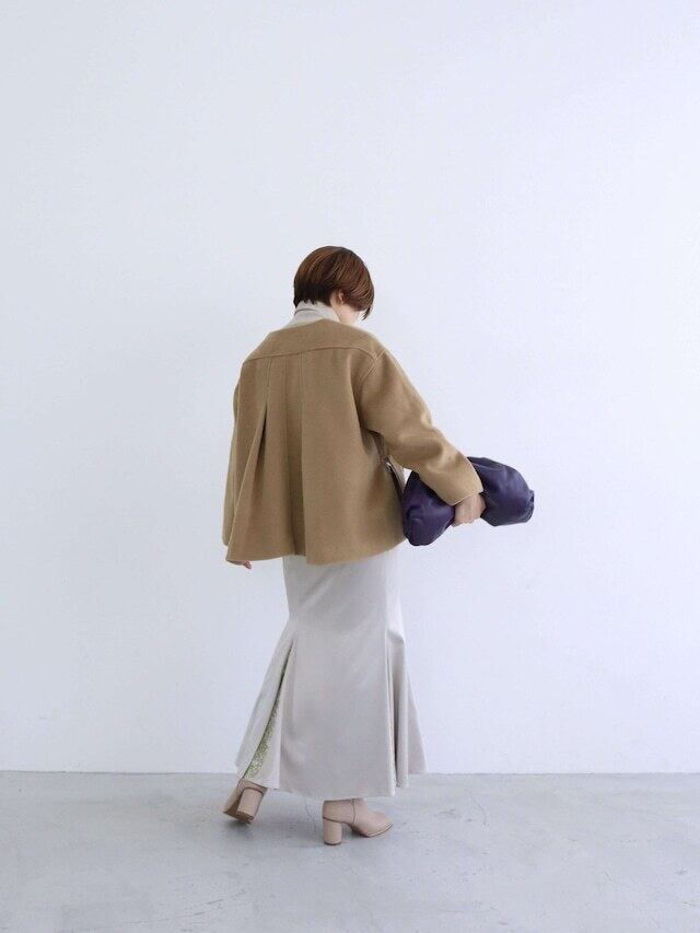 背中に大きく入れたタックが、立体的なテントシルエットとドレープを作り出し、横や後ろから見た時に可愛さが最高潮へ