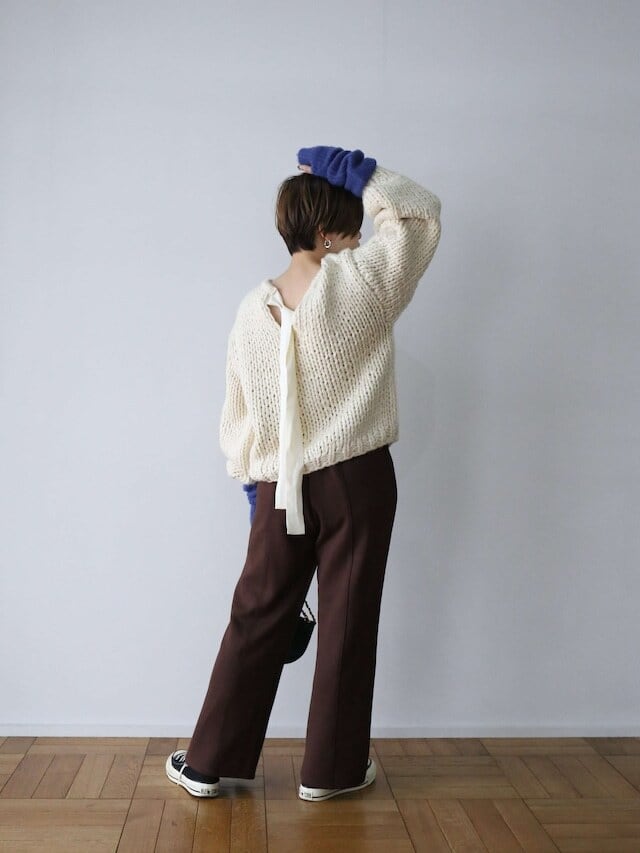 肉厚でたっぷりとしたデザインですが、着膨れの感もなく着用できます!手首でしっかりと止まってくれるので袖のボリュームが可愛いニットです◎裾もしっかりとウエストで止まってくれます!中にニットやカットソーをレイヤードするのもオススメです?