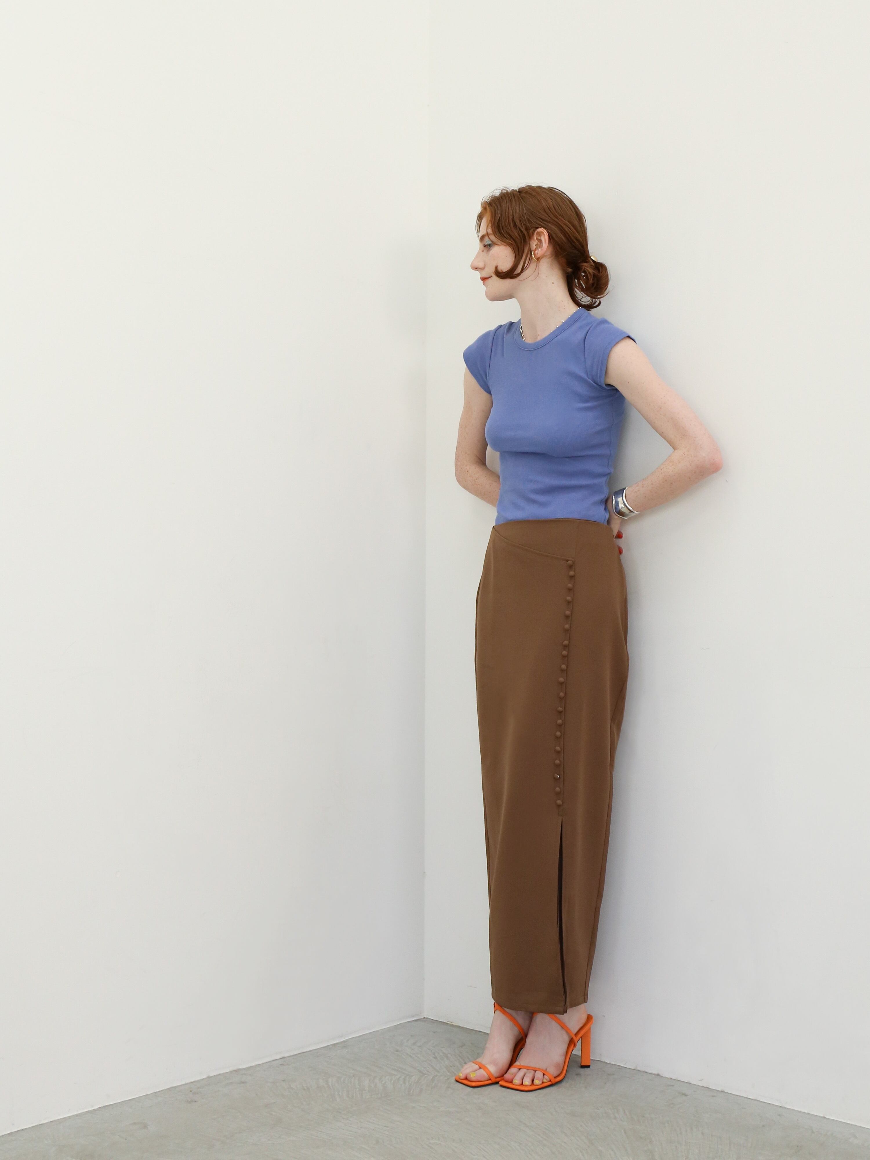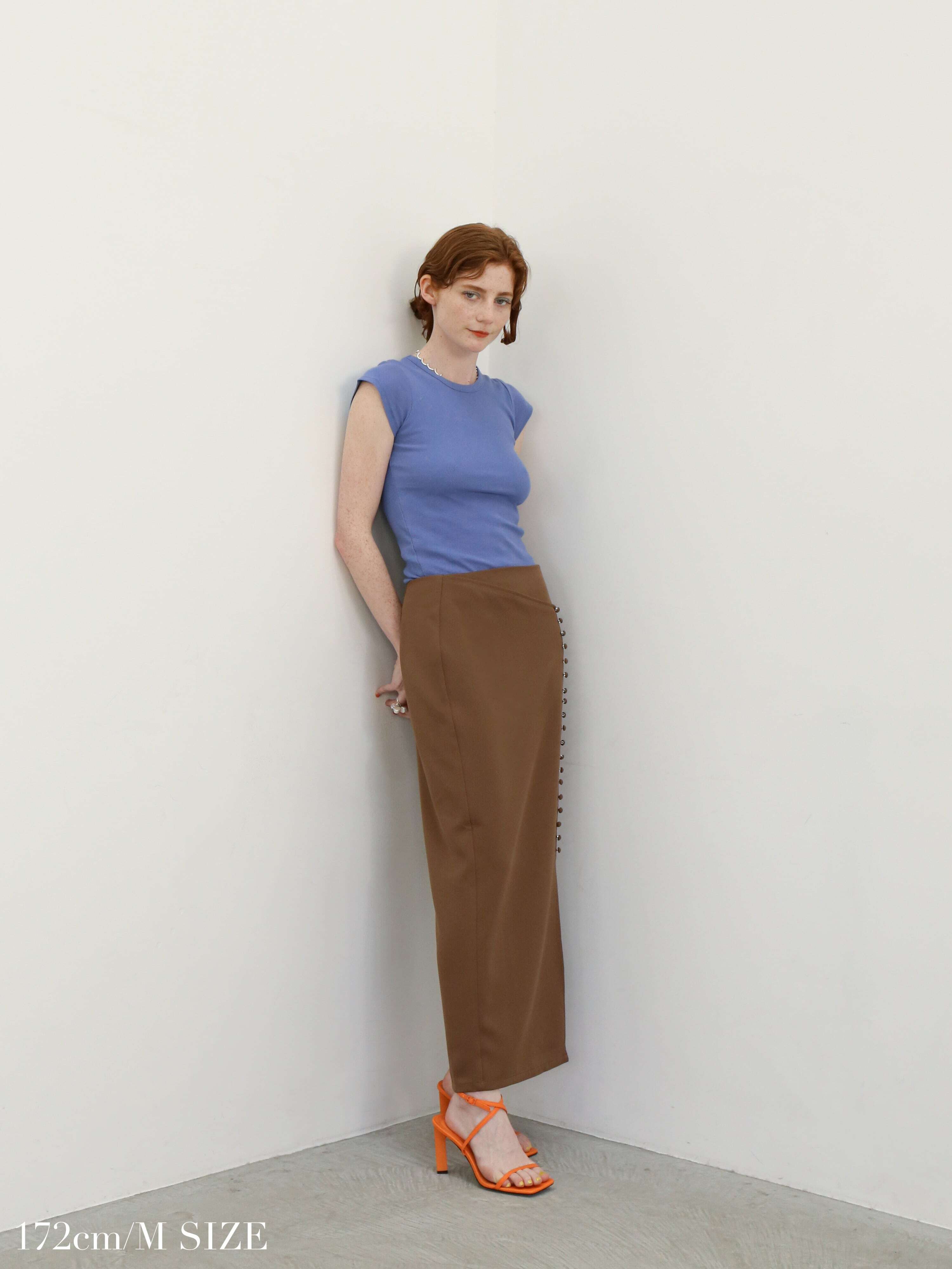 ラップスカート風のウエストデザインや贅沢に並んだくるみボタン、こだわりのカラーなどエッセンスを詰め込んでいるのでシンプルなトップスと合わせても十分様になる優秀な一着です