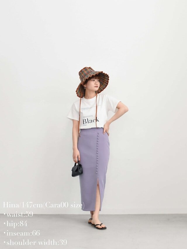 Hina 身長147cm/ウエスト59cm/ヒップ82cm/股下66cm/Cara00サイズ着用