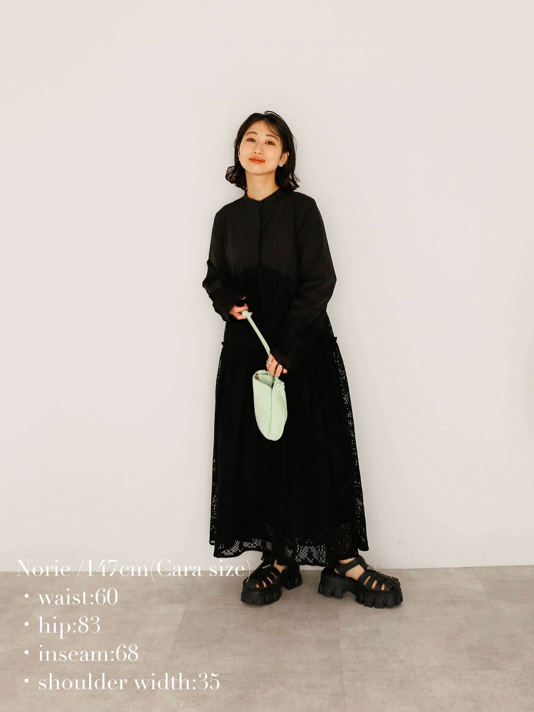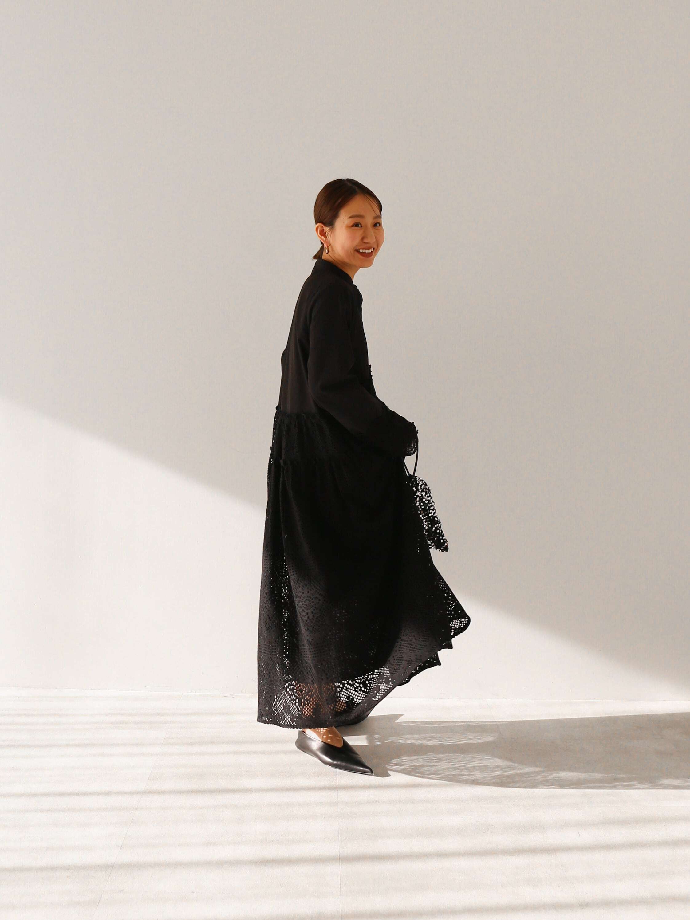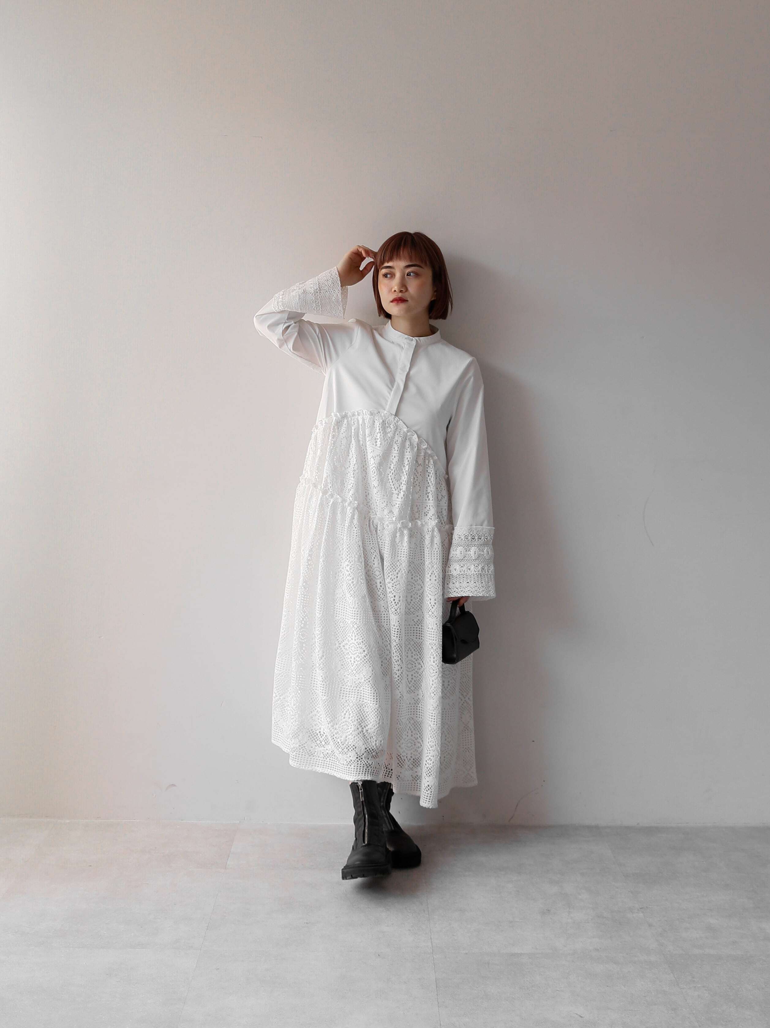 ・black:レースの透け感でblackのティアードワンピースも重くなりすぎません。バンドカラーも相まってモード感溢れる一枚です。
