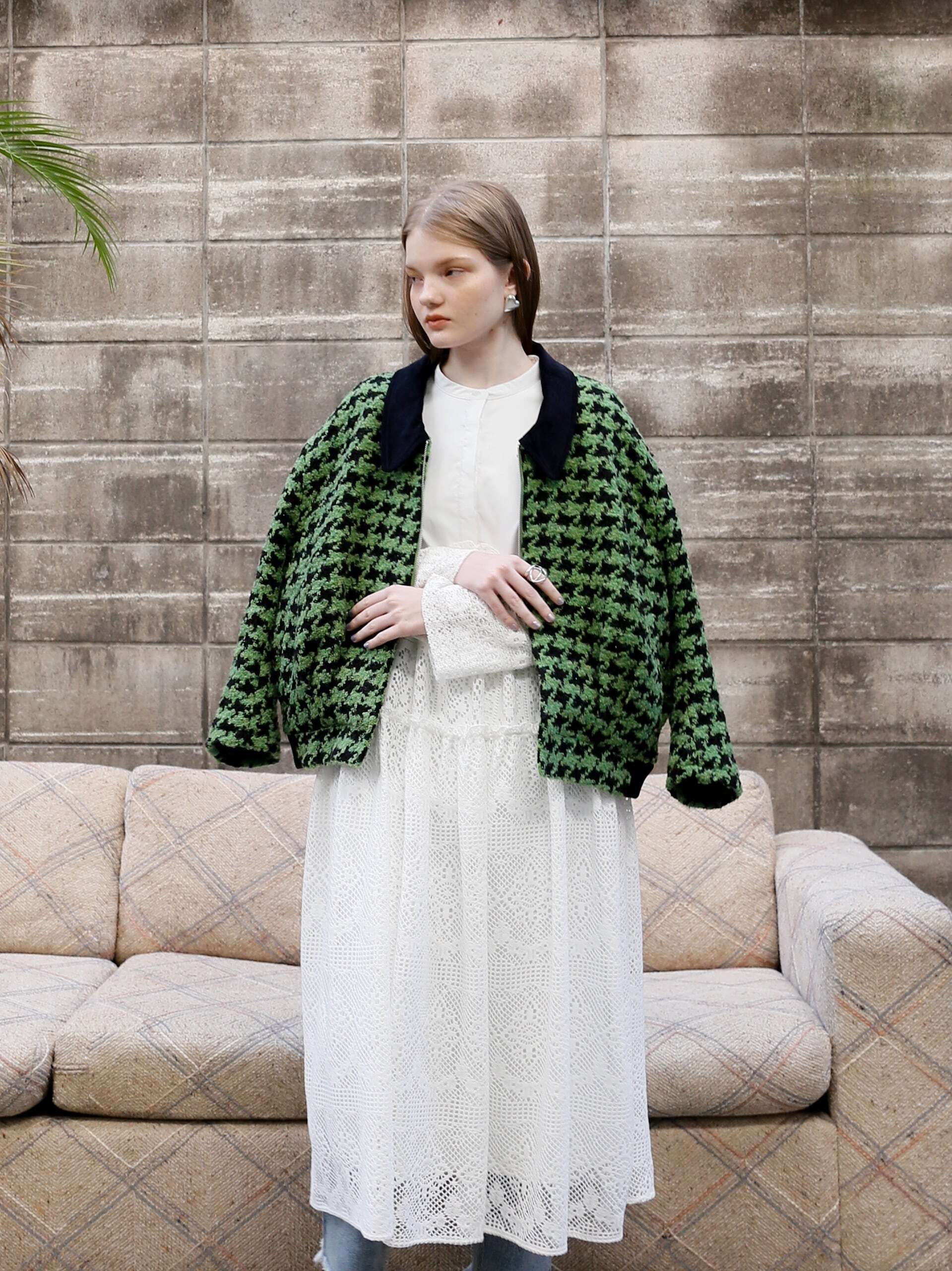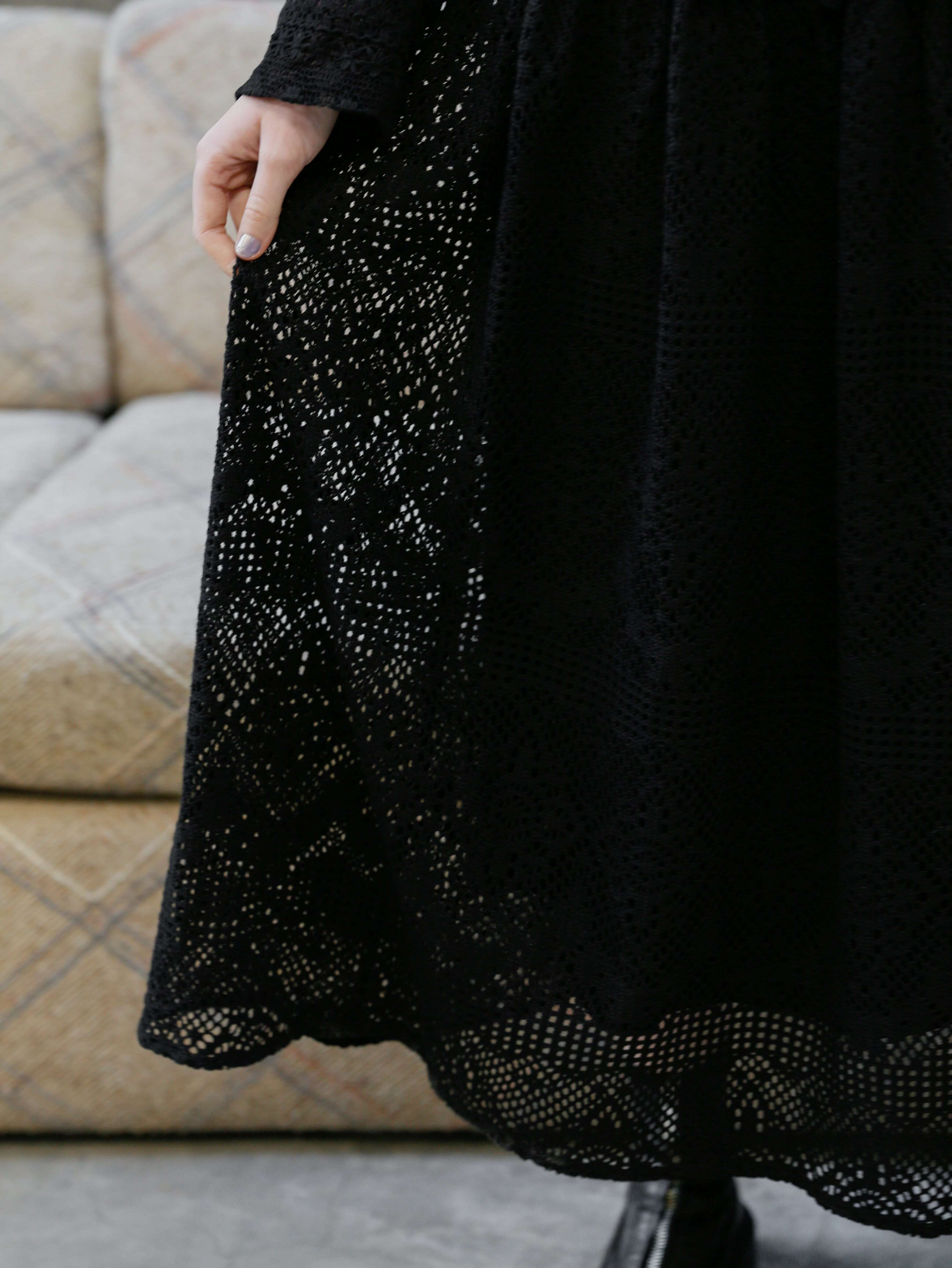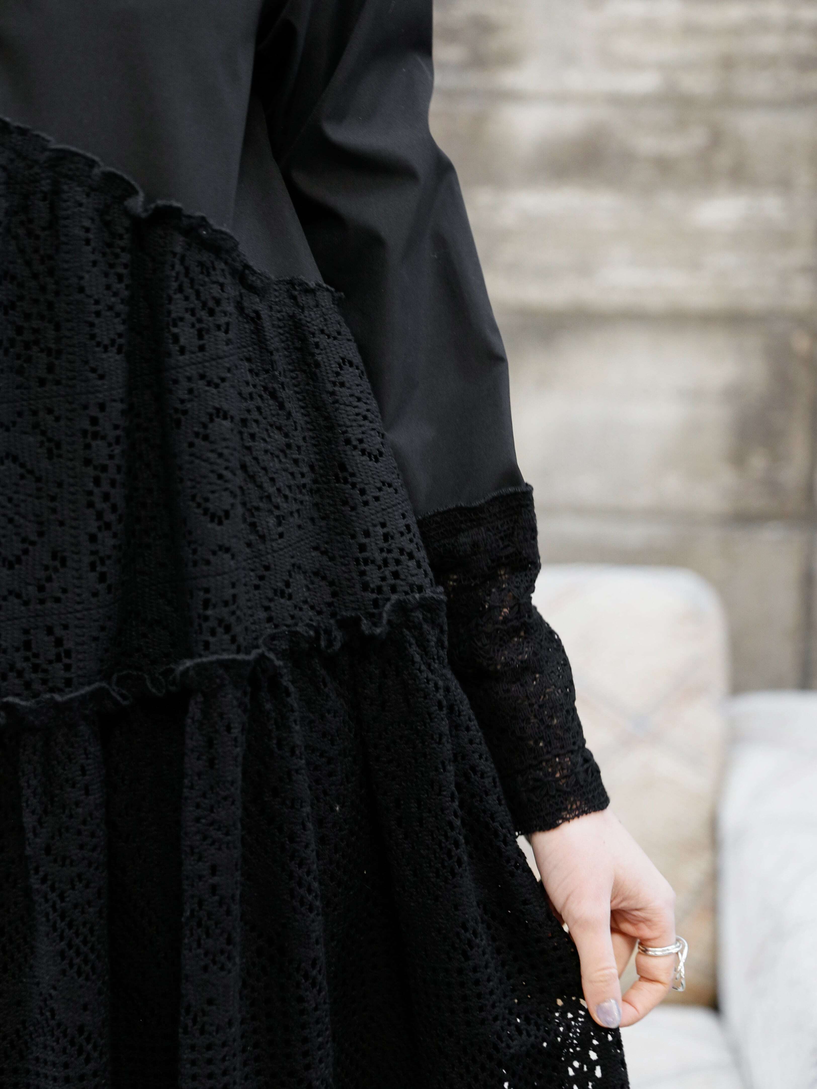 袖先の繊細感のあるレースとモードなシルエットのギャップはお洒落