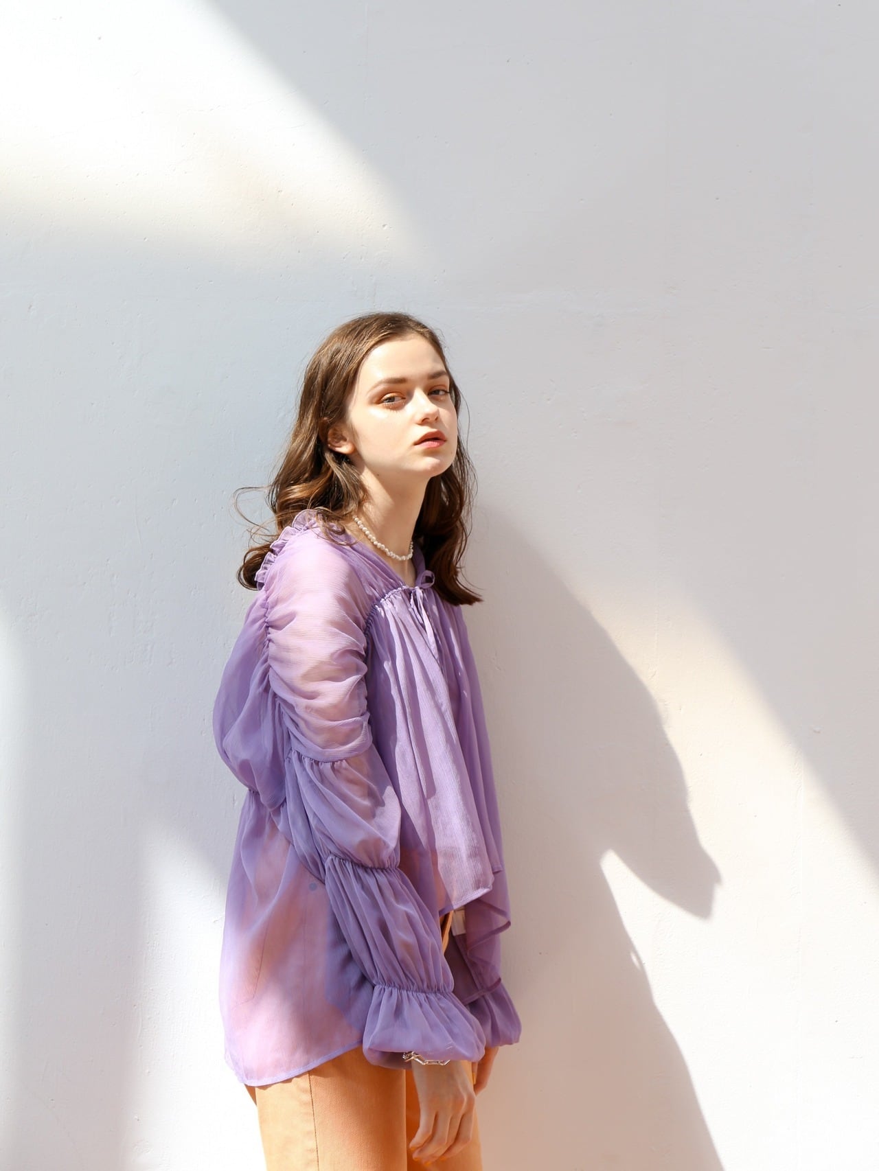 ・gray blue:絶妙なブルーの色みで、暖色・寒色問わずカラーパンツとも好相性。柔らかな透け感があるのでブルーでも血色が悪くならないこちらは普段ブルーを避けがちな方にも是非手に取っていただきたい一着です