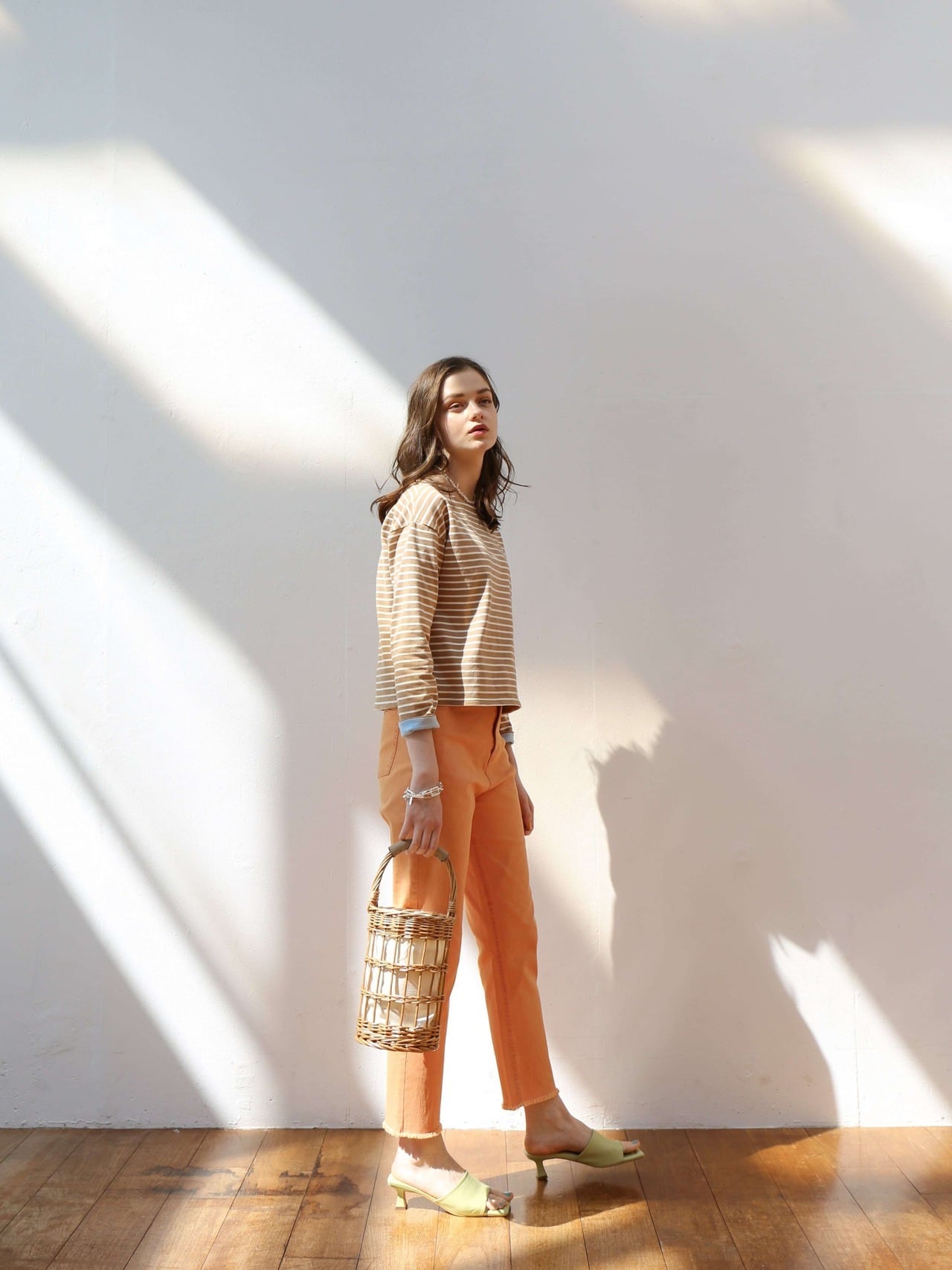 ・カラーパンツがトレンドである今季、デニムでカラーを取り入れるのも手?ソリッドな生地では強すぎるorangeも加工感のあるデニムなら取り入れやすく◎