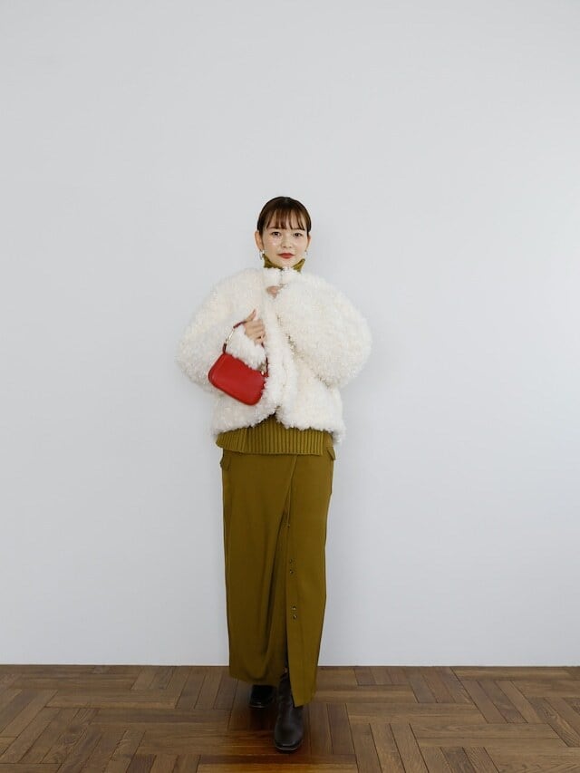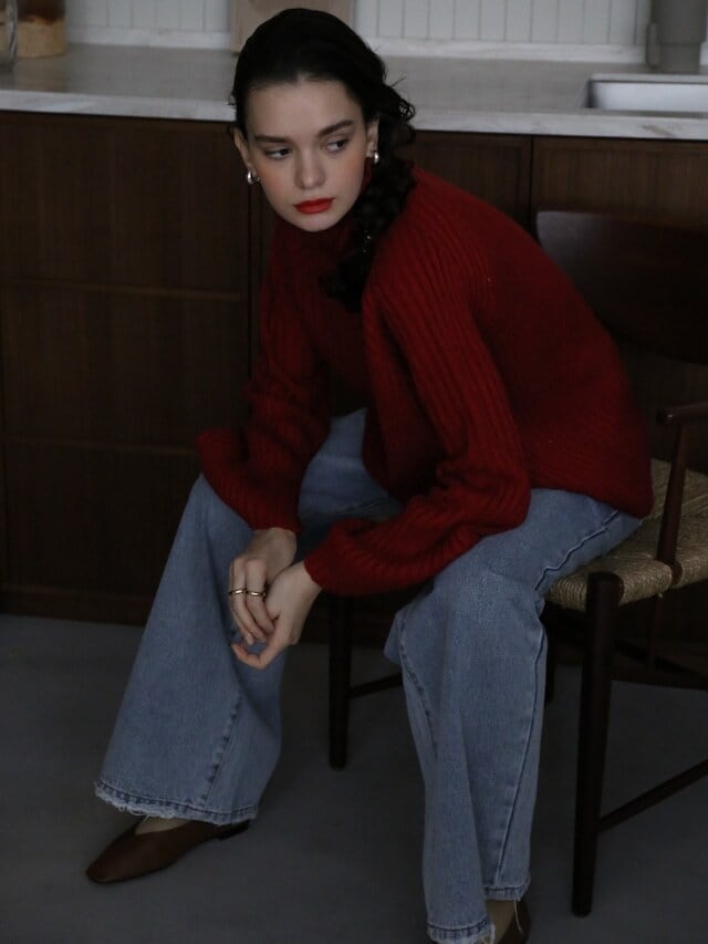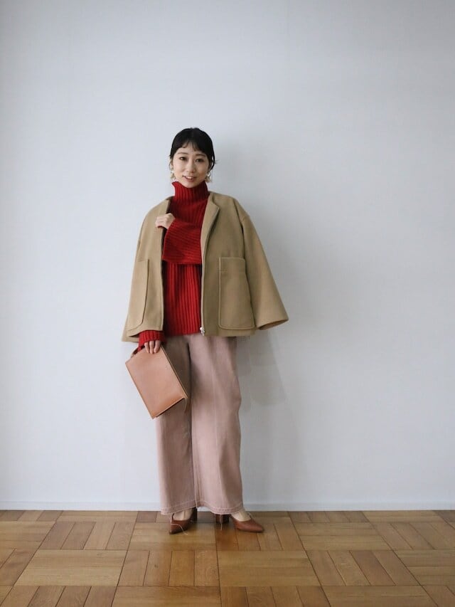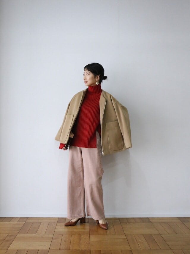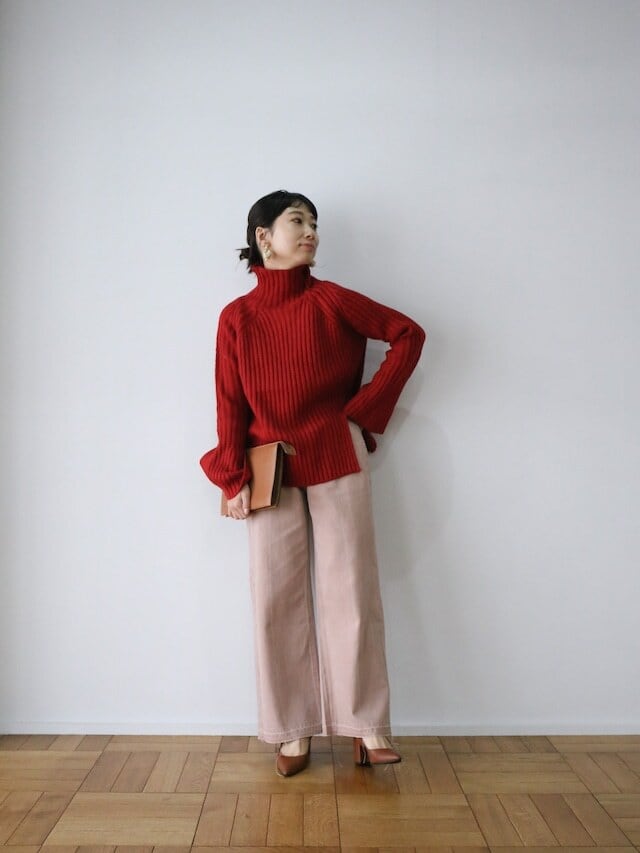 ・red:冬に着たくなる深みレッド。デニムやパールと合わせたスタイリングはマスト。今年はピンクやオレンジなど思い切った色合わせでも楽しみたい。大人な赤だからカラーコーデも包容力高くまとめてくれます