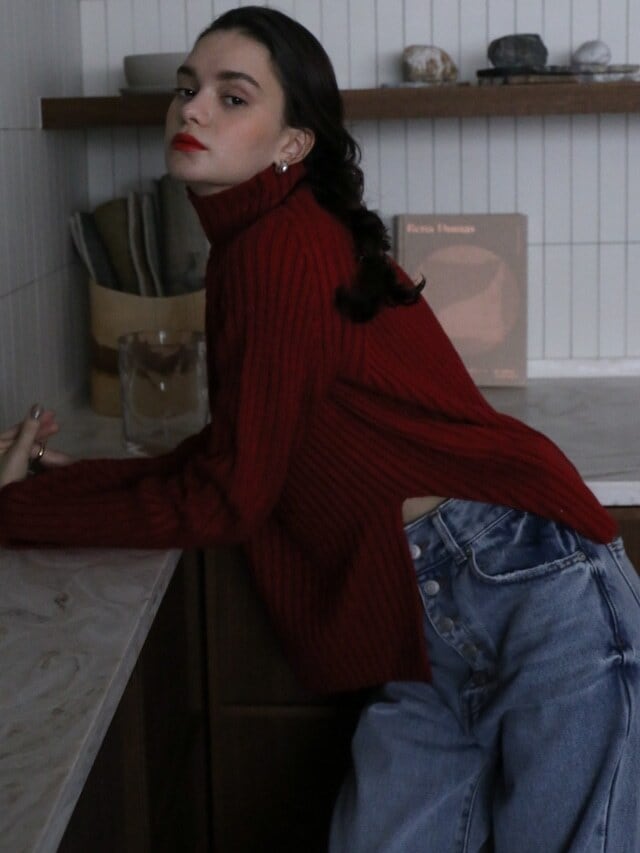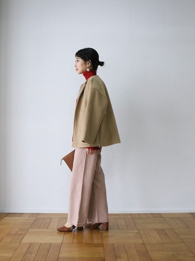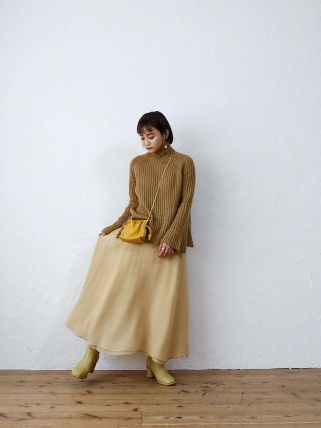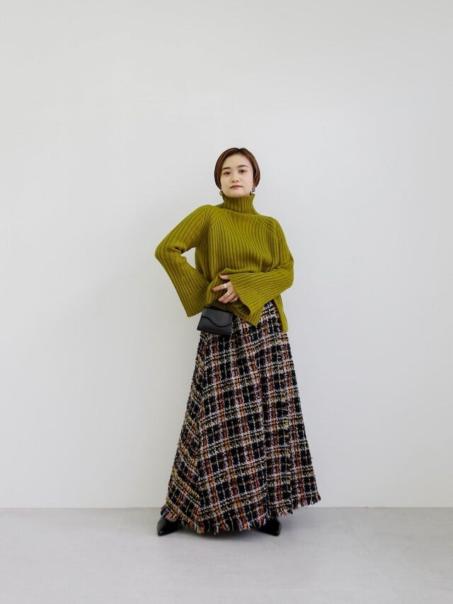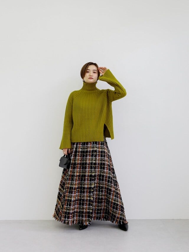 ハイネックのニットは着膨れして見えがちですが、落ち感のある生地だから体にすっと馴染んで細見え効果抜群
