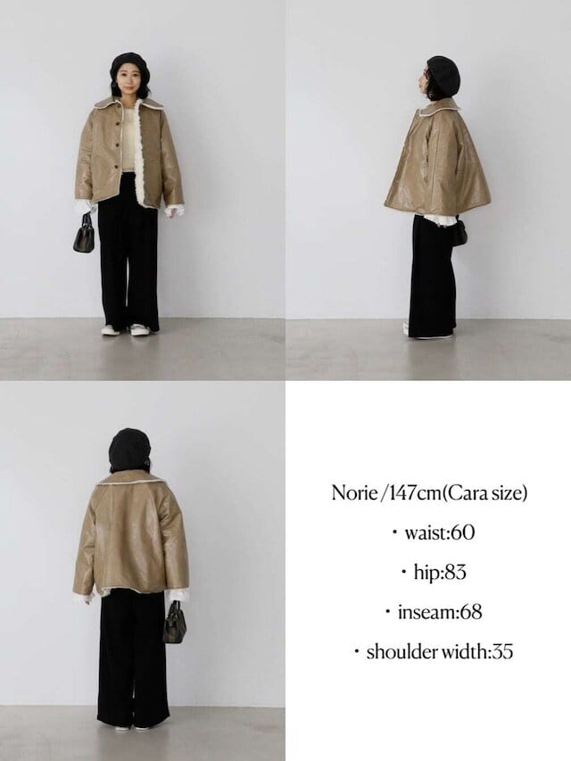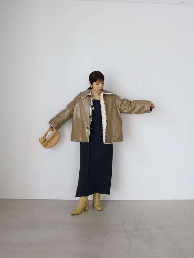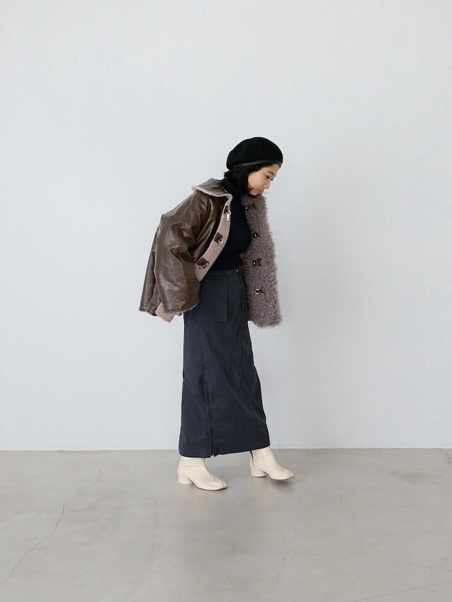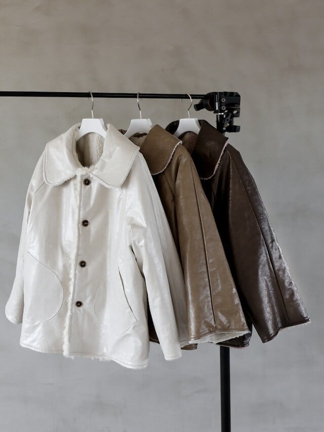 ・brown:こっくりしたレザーのbrownと他には無いモーブのボアの組み合わせが魅力的。ボア側を表にするとカラーコート、レザー側を表にするとベーシックカラーのコートと、1枚でカラーの印象も大きく異なります。
