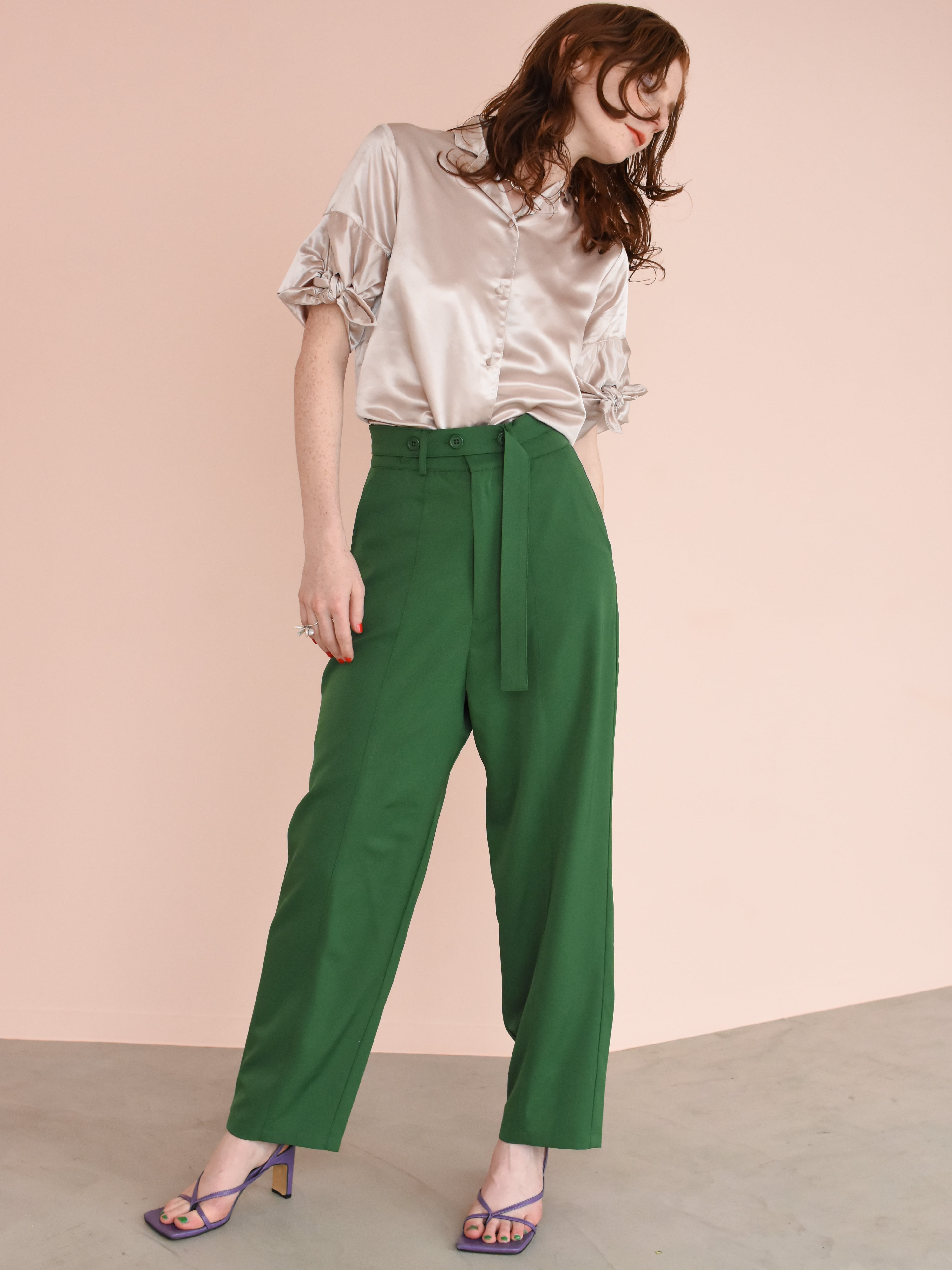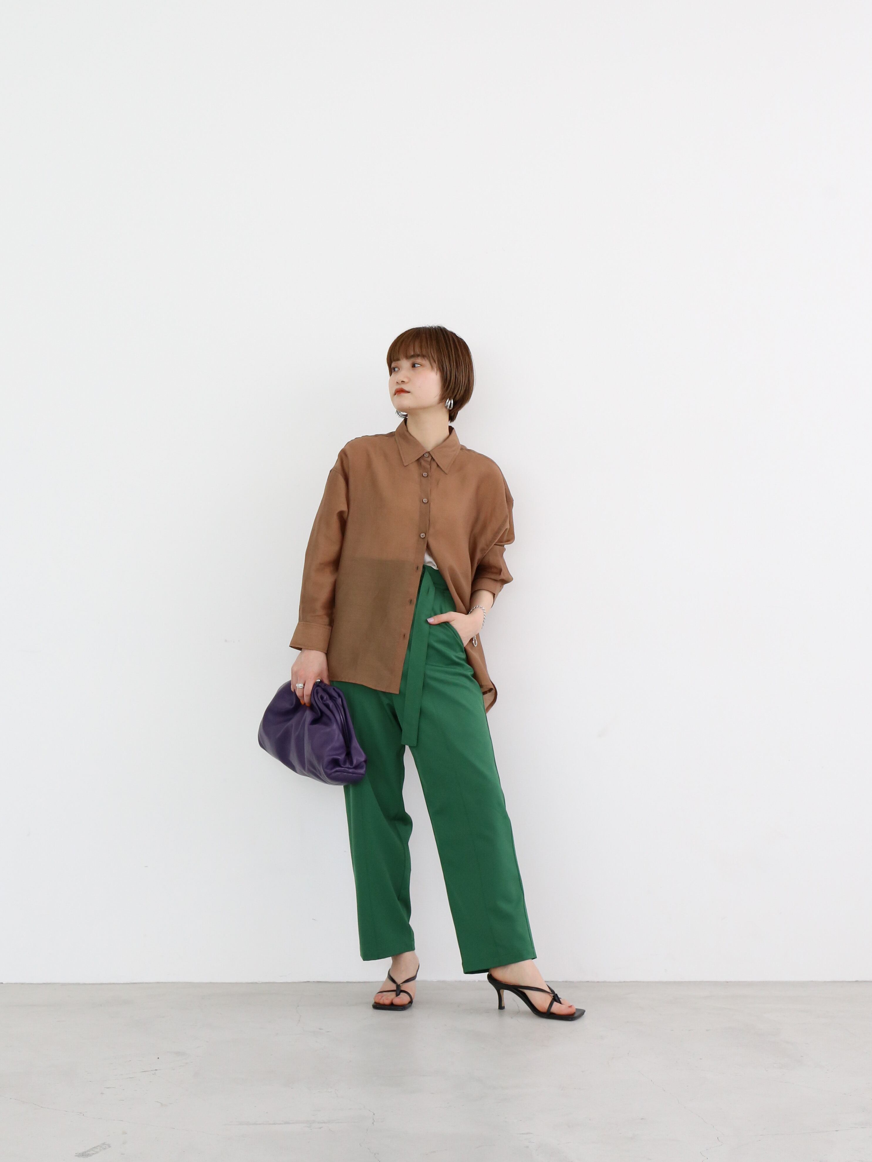 ハイウエストを強調し、すっきりとした縦感を演出するベルトデザイン