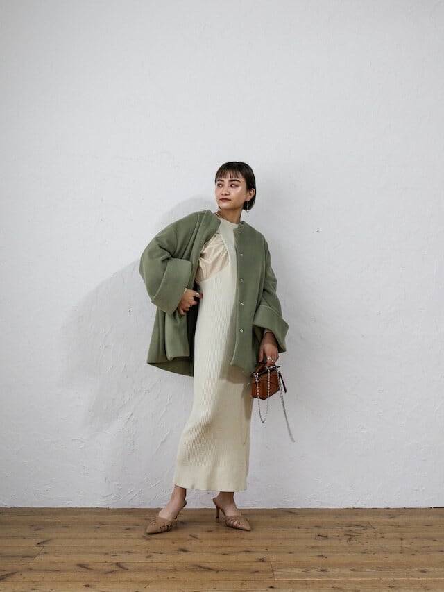 ・green:まろやかなgreenは、ベーシックと差し色の中間的な存在として頼もしい一色。カーキにミルクを足したような色だから、合わせ方次第で主役にも脇役にも回ってくれます。鮮やかなカラーコートには手が伸びなかった方にもおすすめです