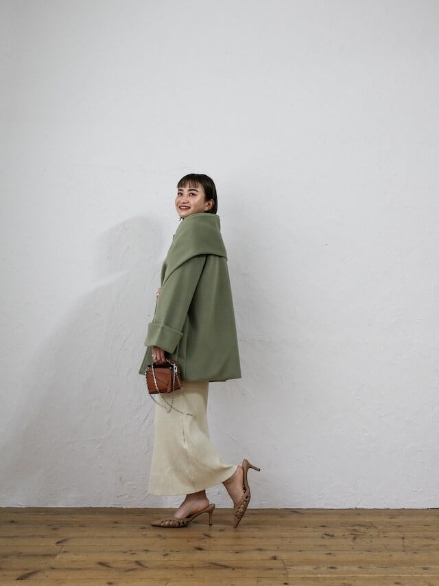・green:まろやかなgreenは、ベーシックと差し色の中間的な存在として頼もしい一色。カーキにミルクを足したような色だから、合わせ方次第で主役にも脇役にも回ってくれます。鮮やかなカラーコートには手が伸びなかった方にもおすすめです