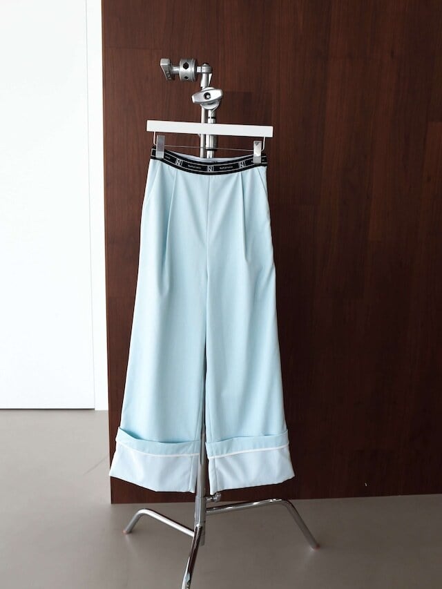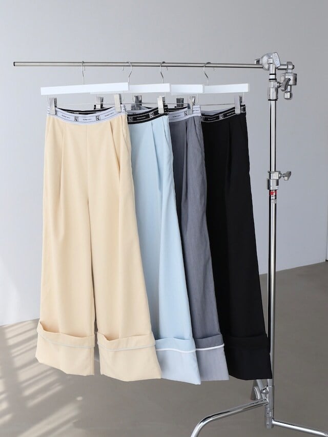 スラックスの裾はロールアップデザイン