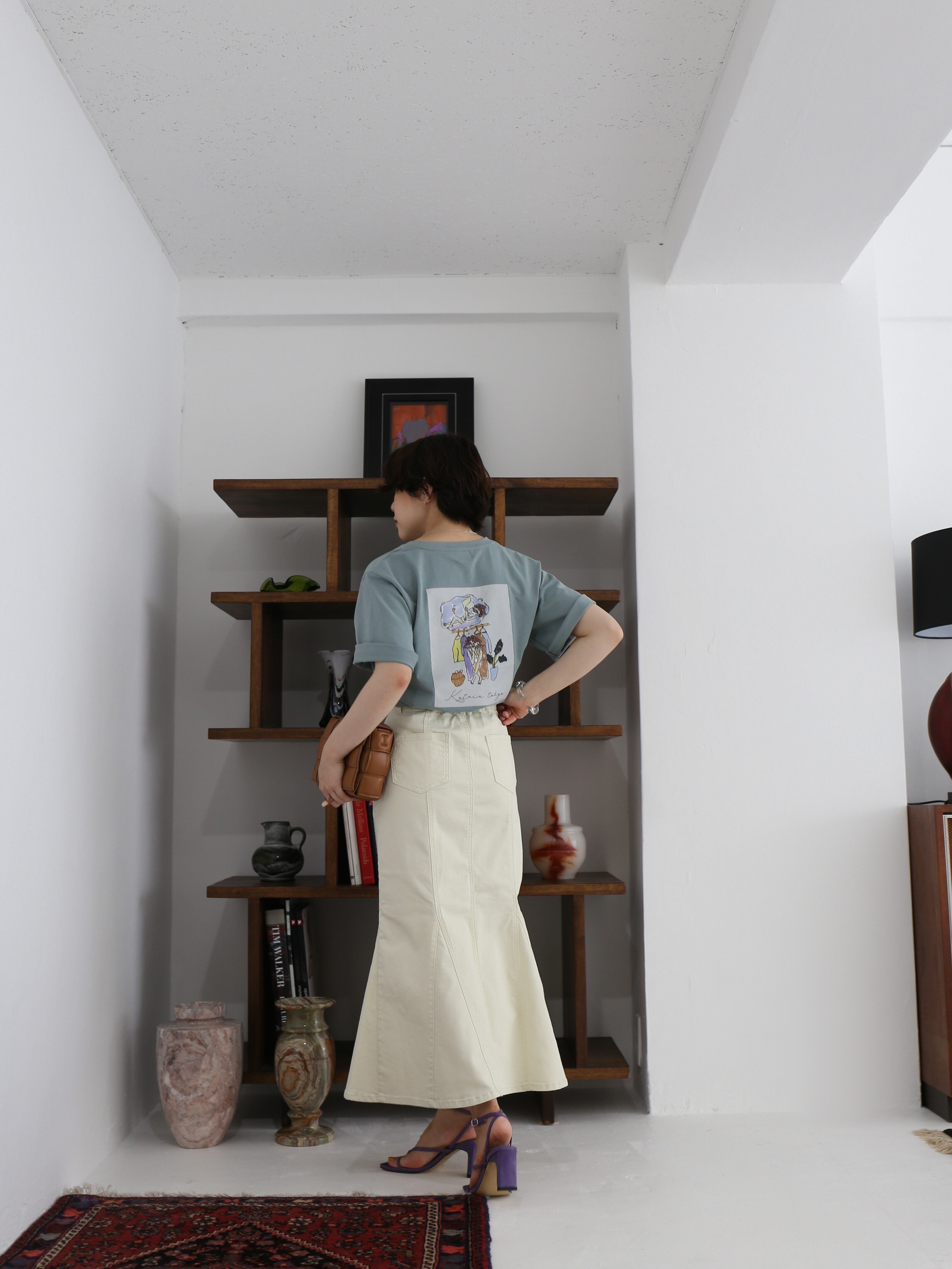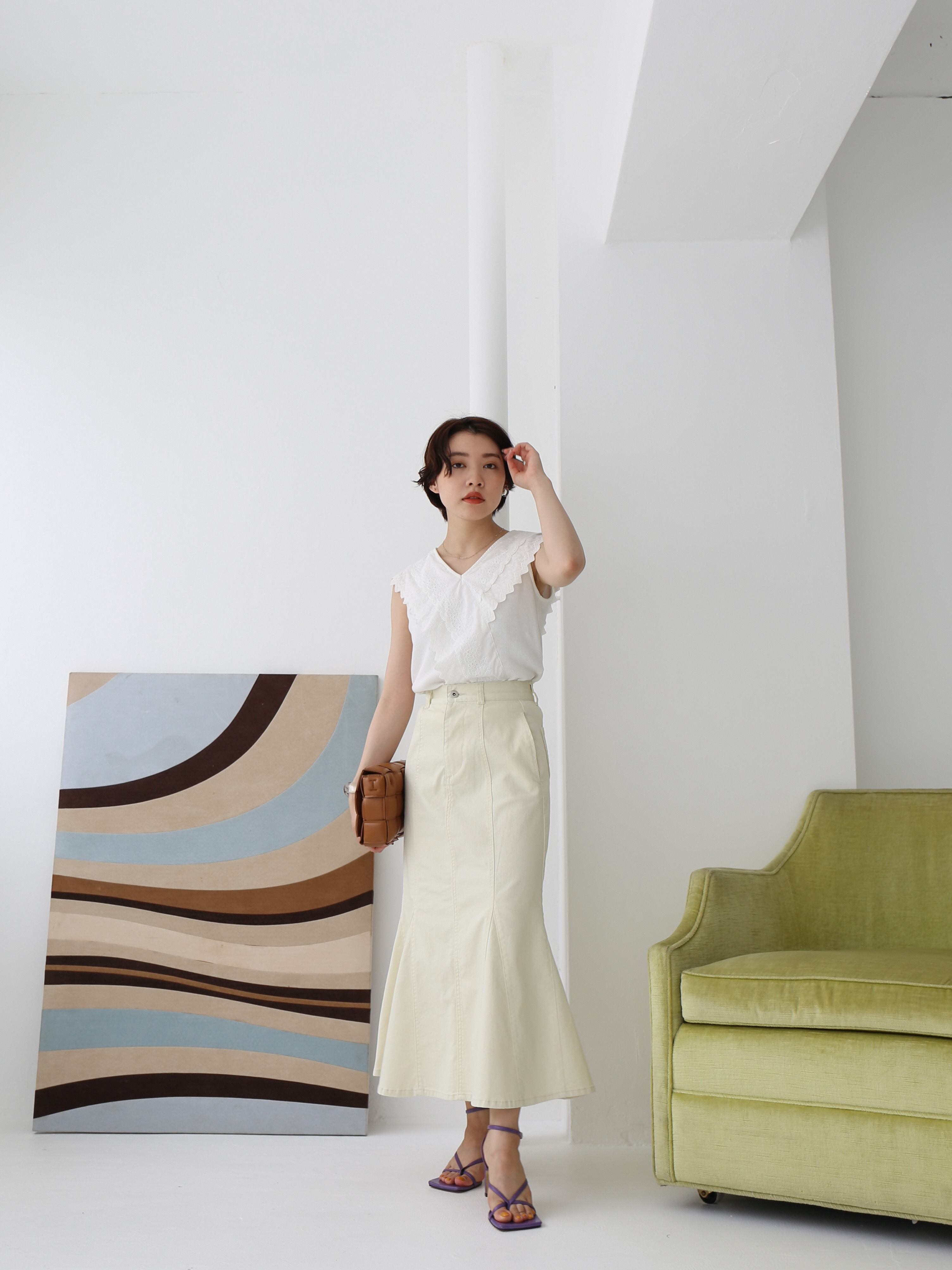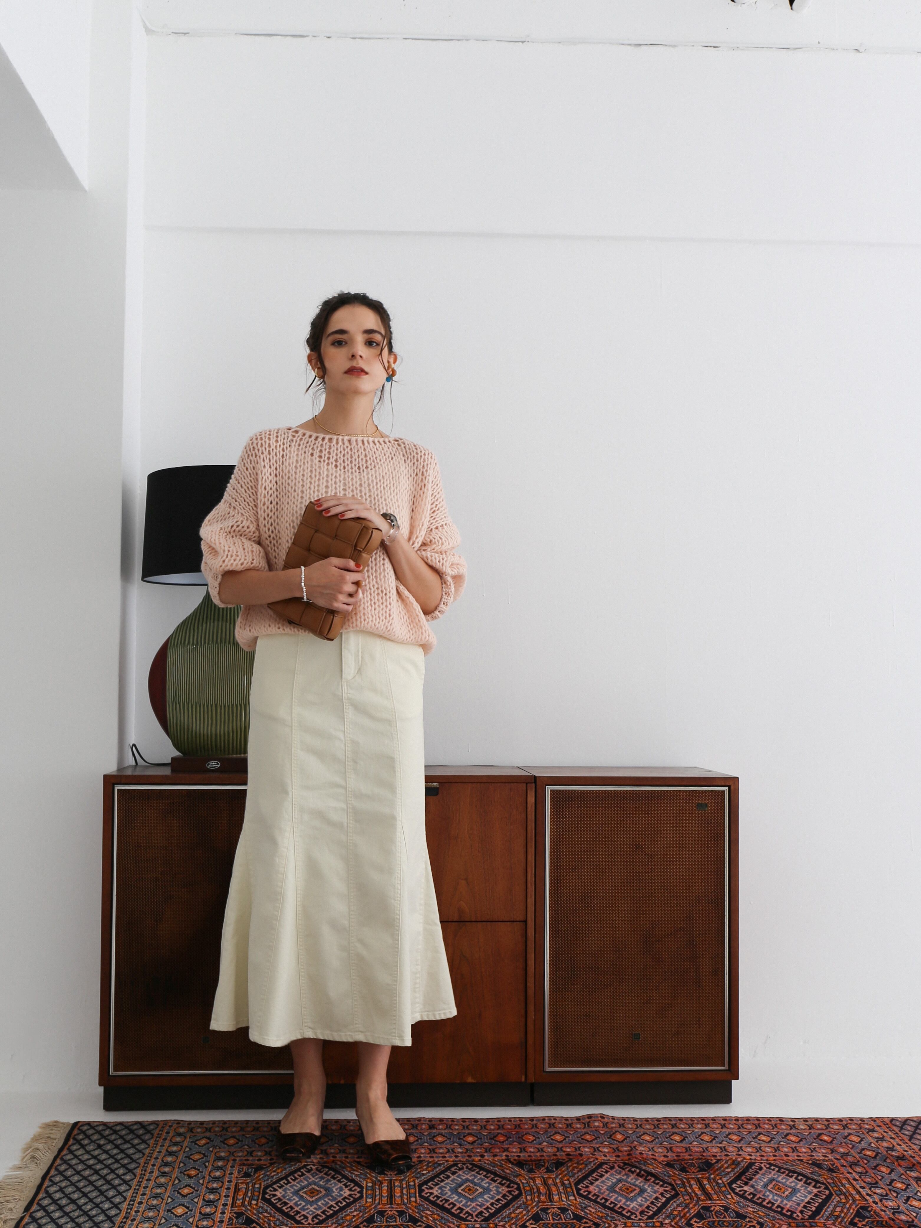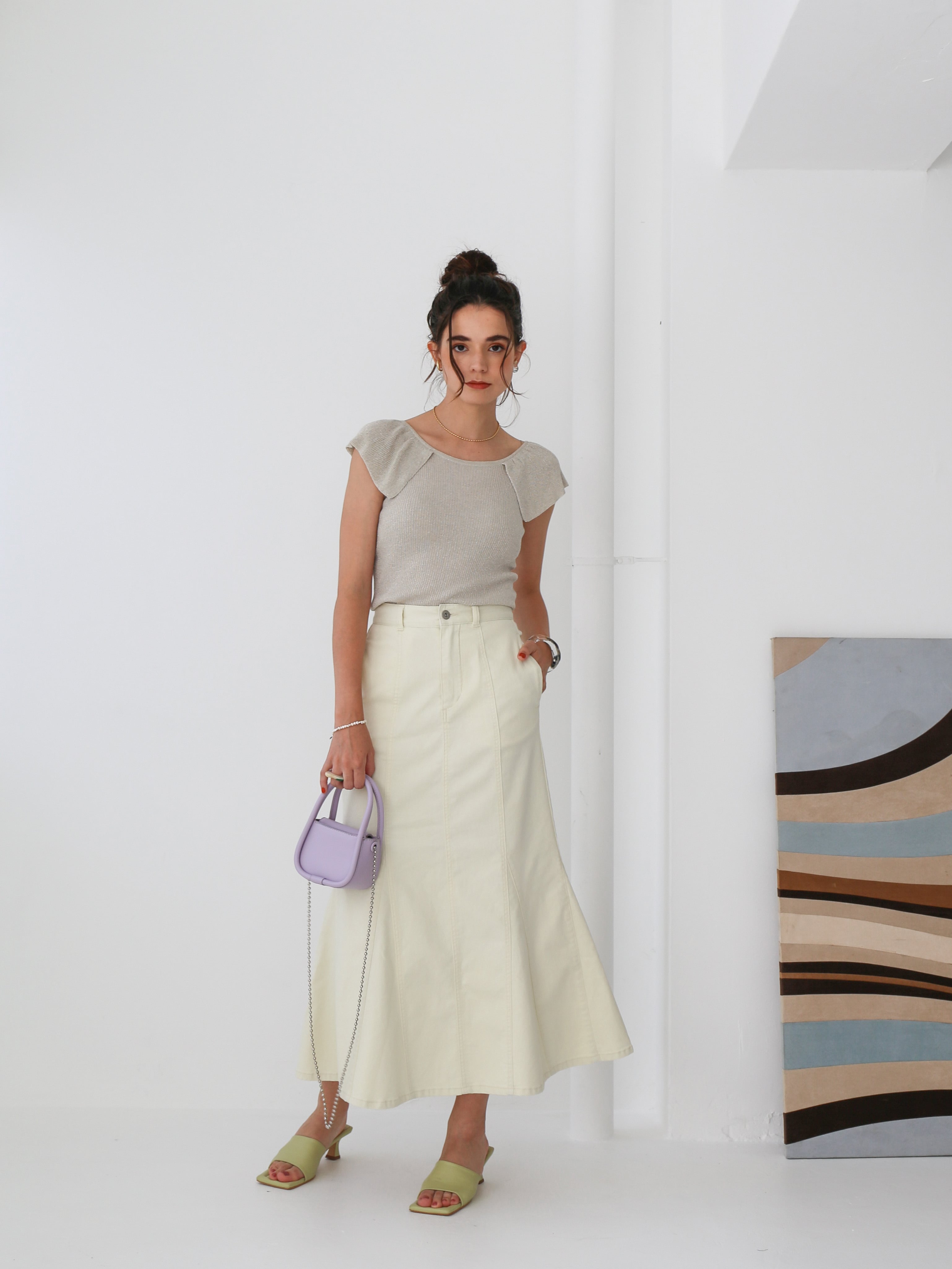 ともすると幼くなりがちなデニムスカートを大人っぽく仕上げた一着です