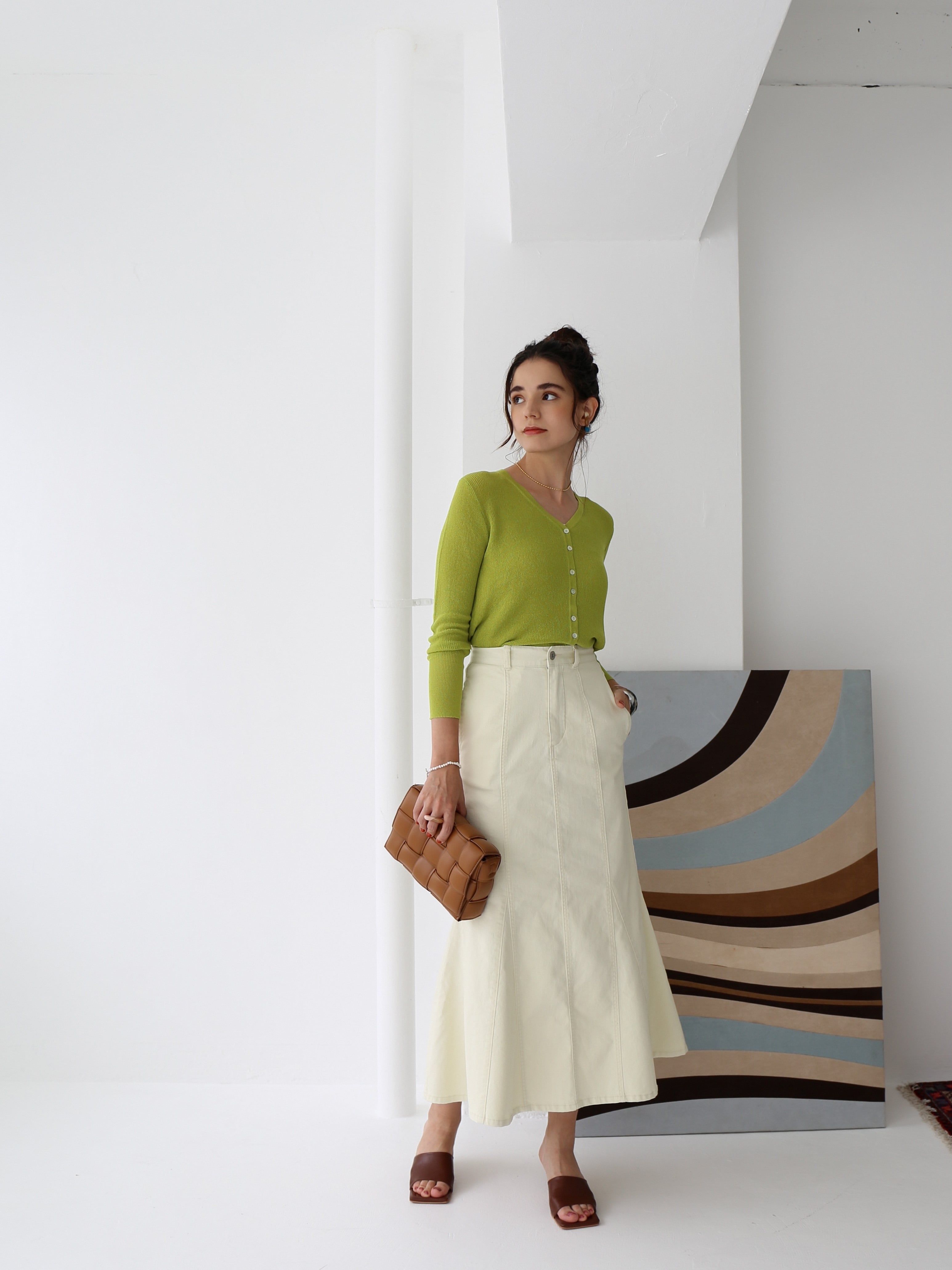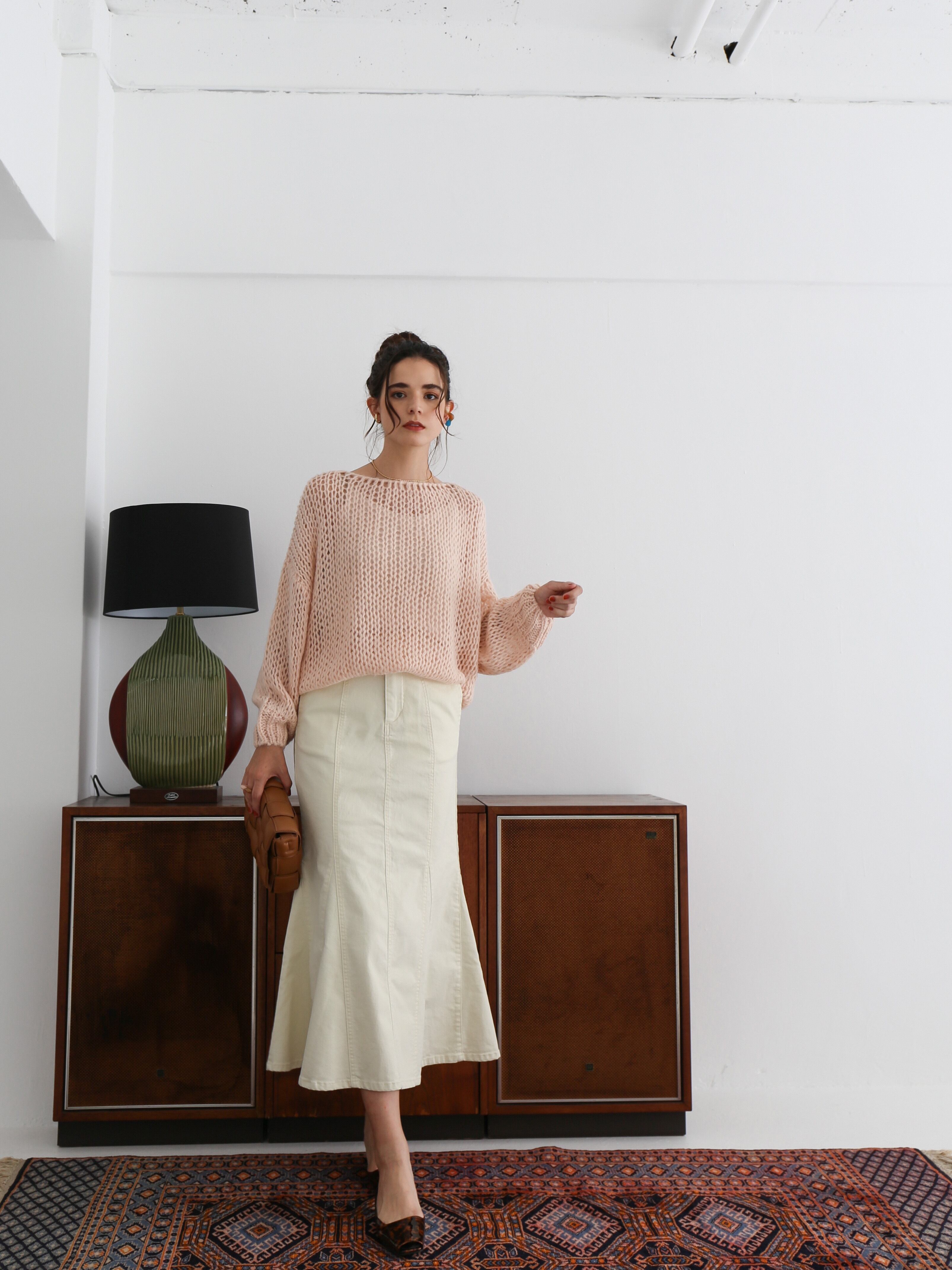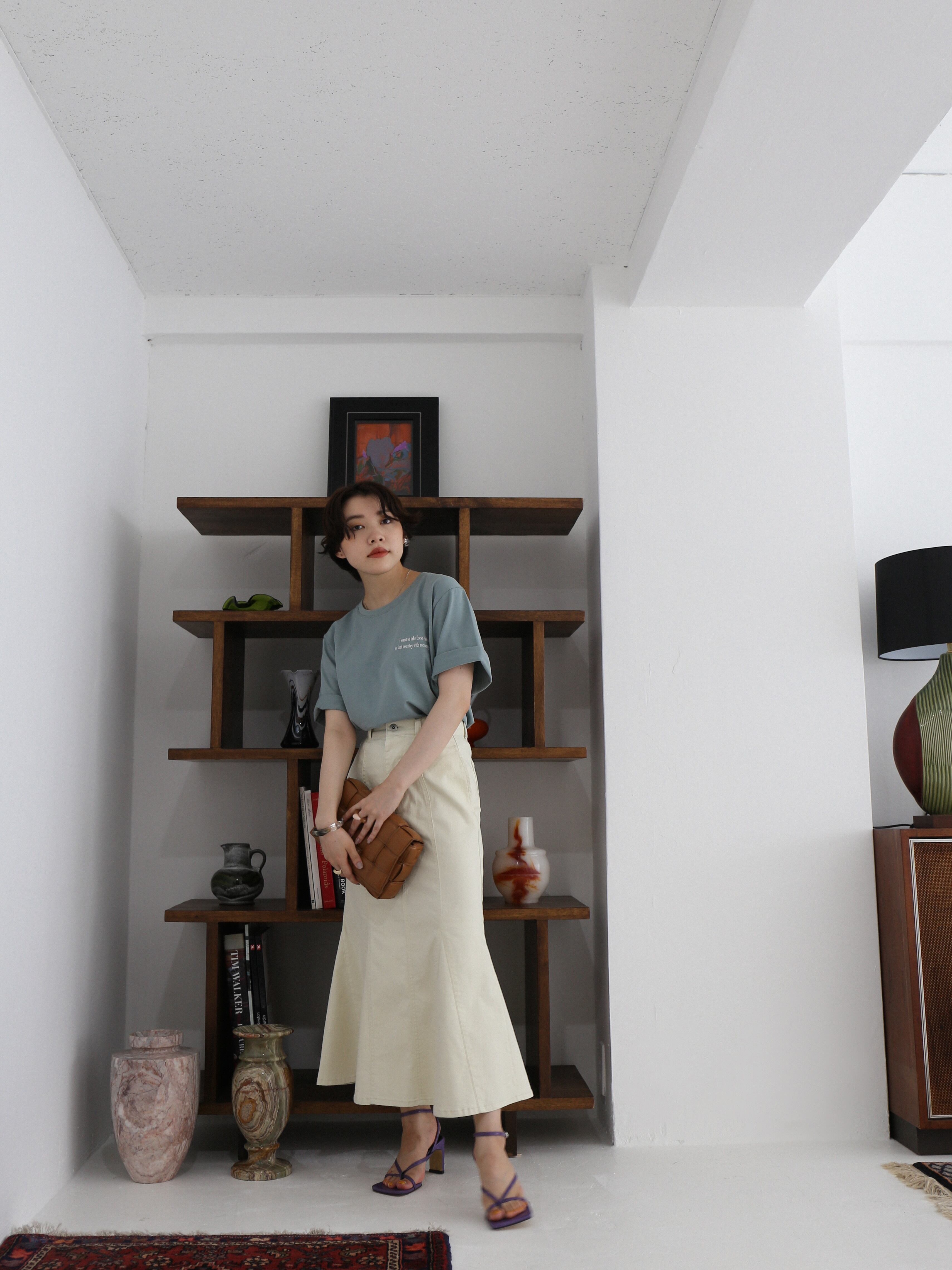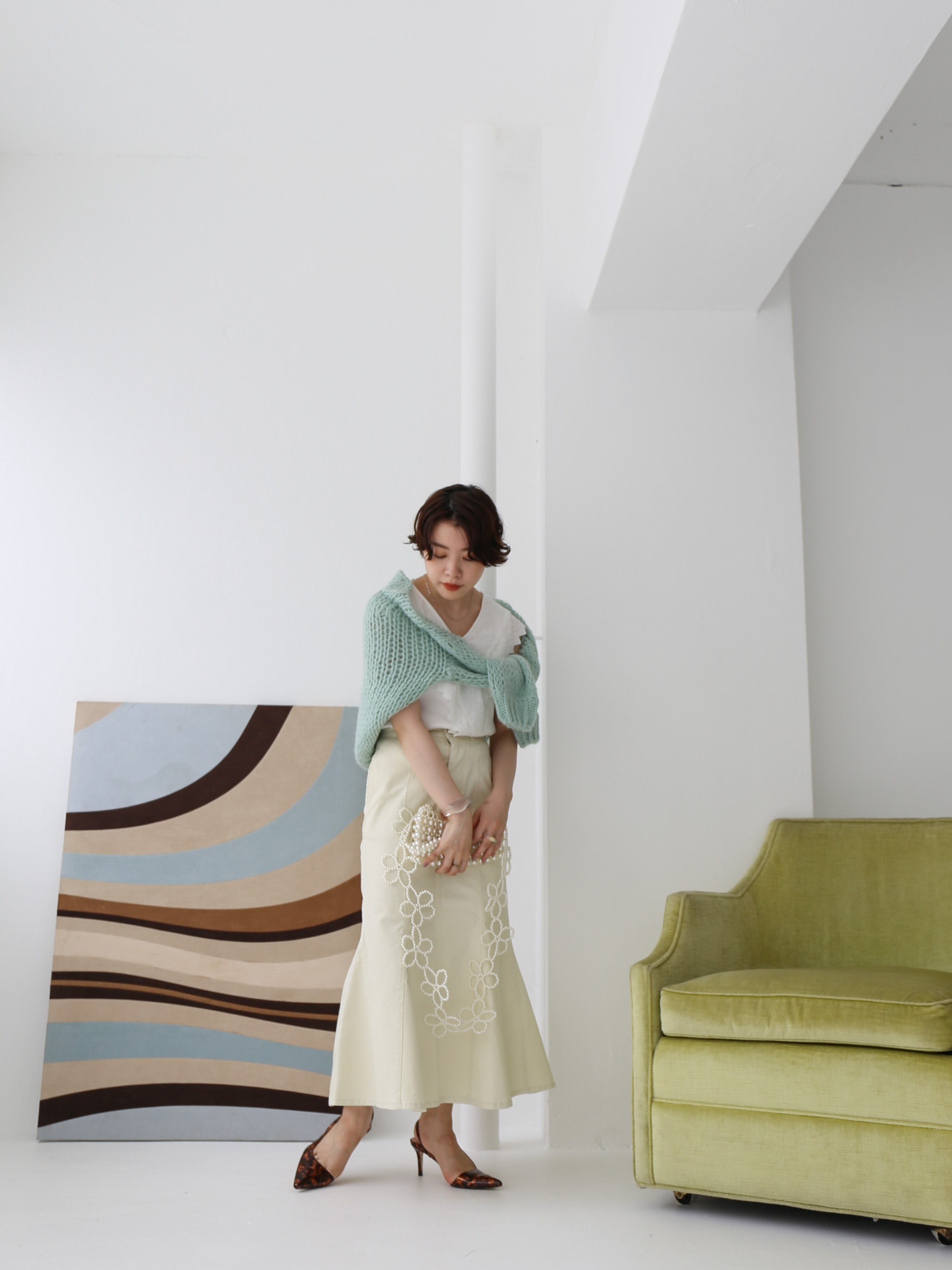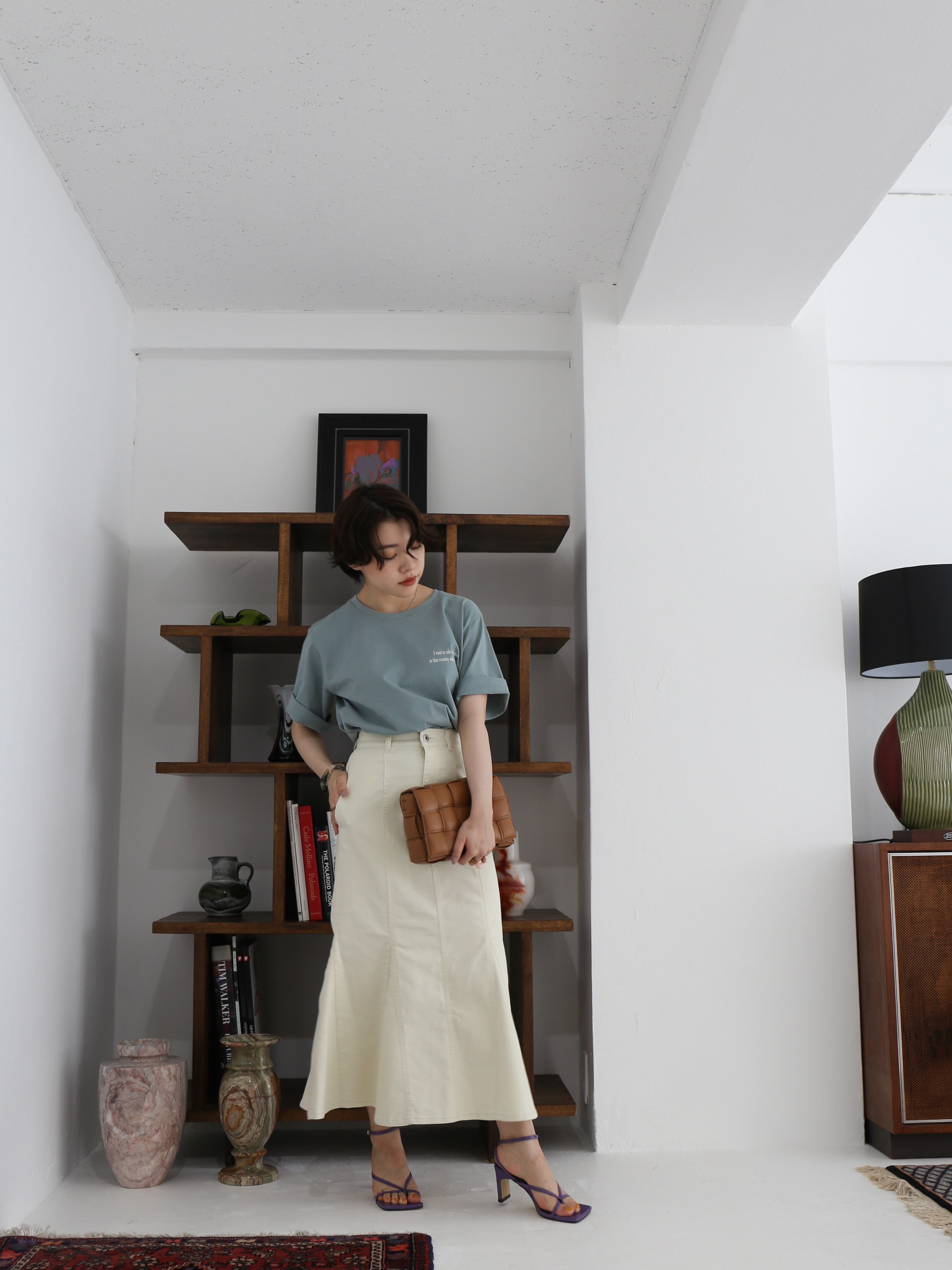 ともすると幼くなりがちなデニムスカートを大人っぽく仕上げた一着です
