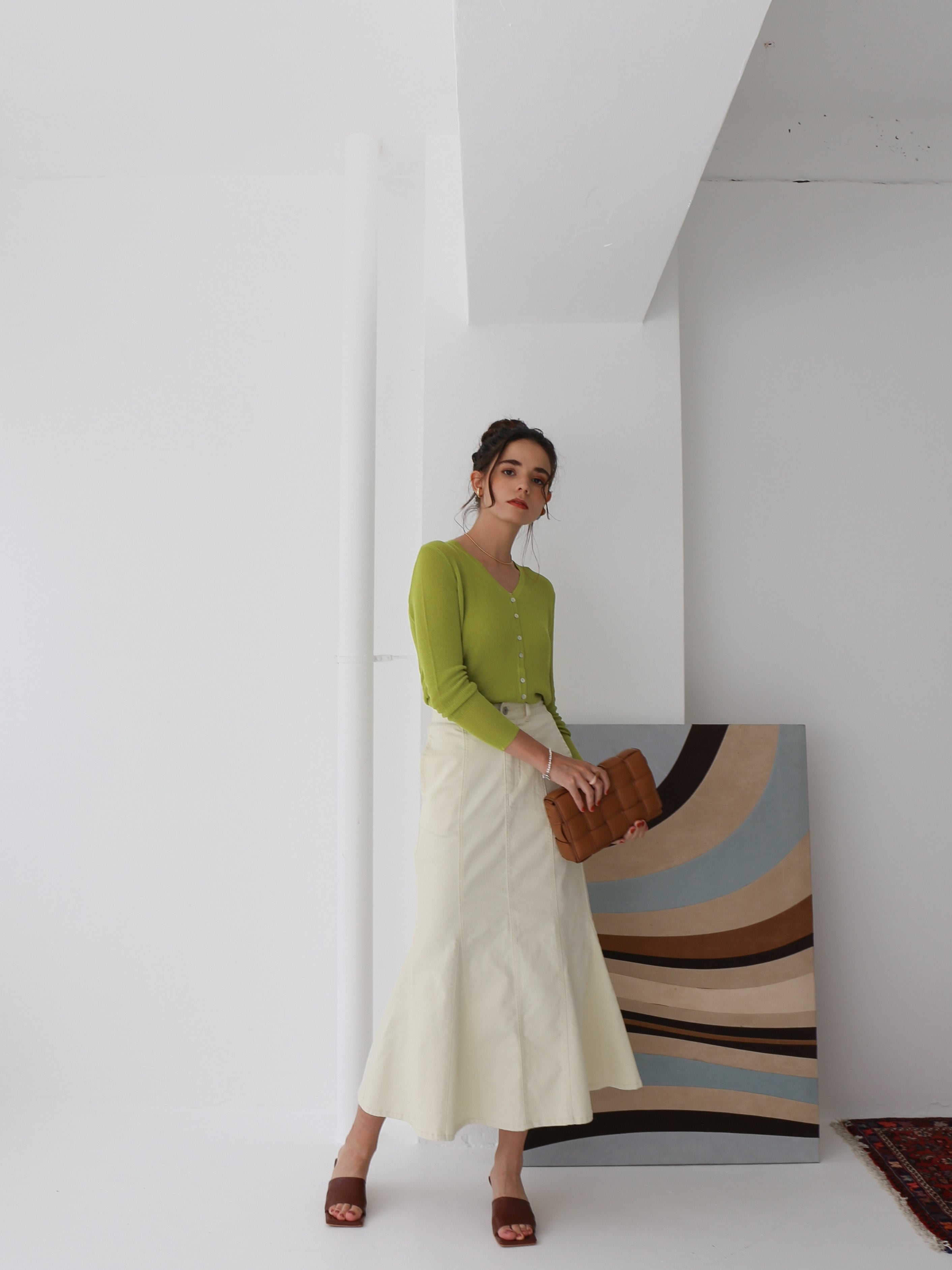 女性らしさを感じさせる綺麗なシルエットで、Tシャツなどを合わせてもカジュアルすぎずお洒落にまとまります