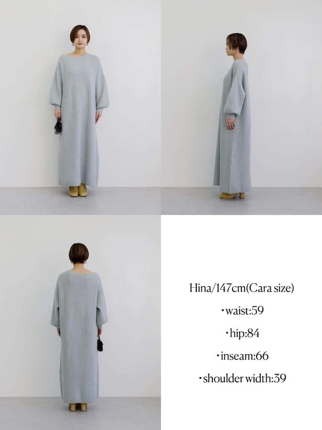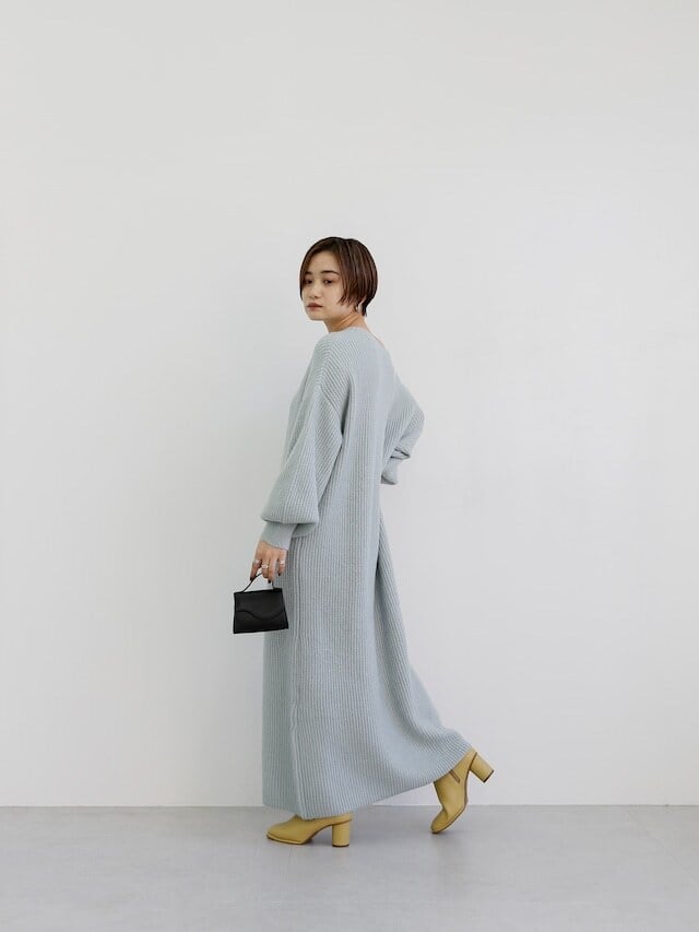 たっぷりとボリュームを持たせたニットワンピースですが手首のリブがきゅっと締めてくれるのでバランスよくお召しいただけます