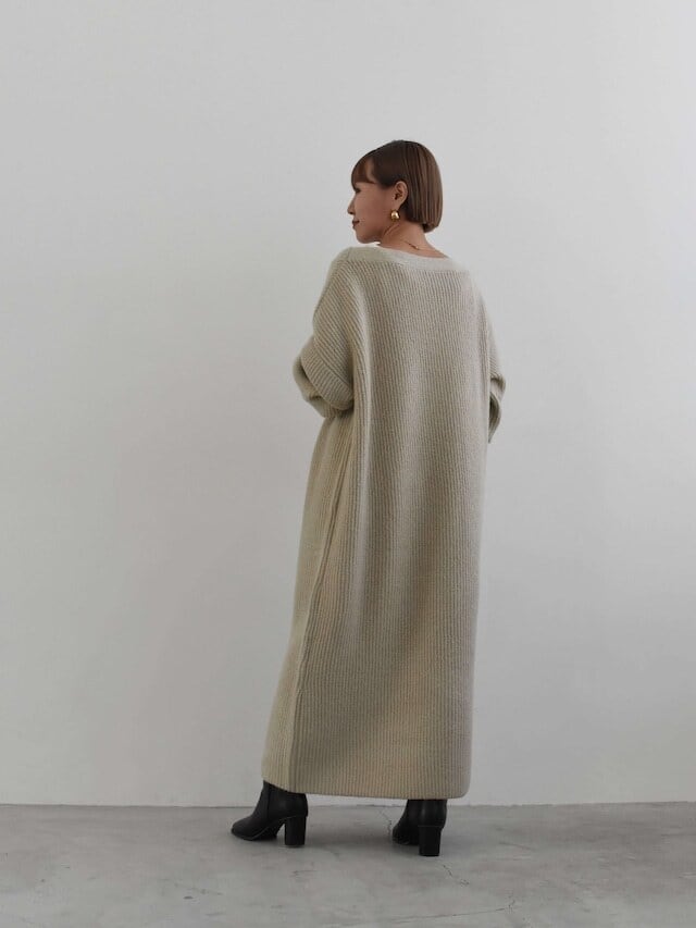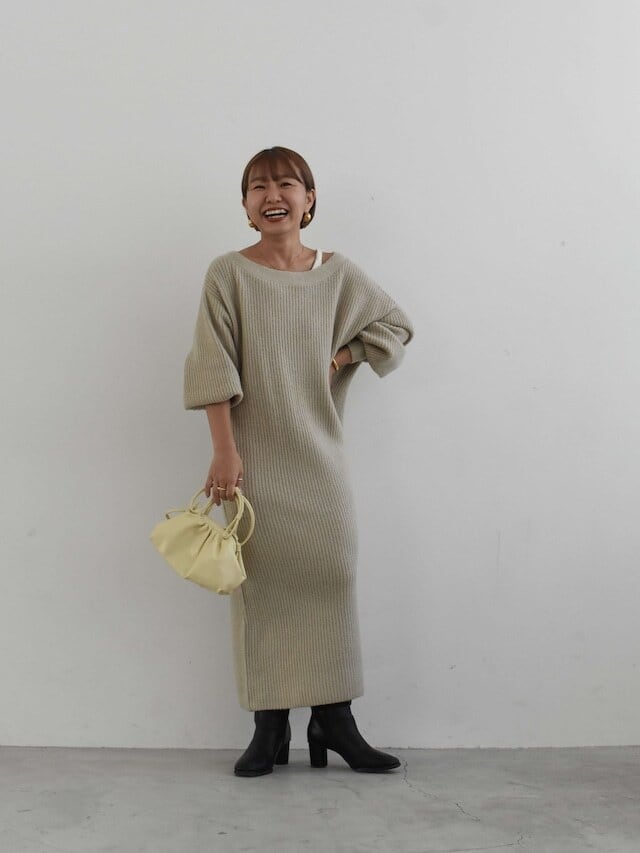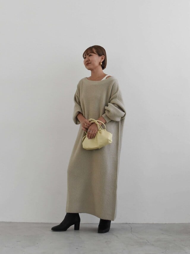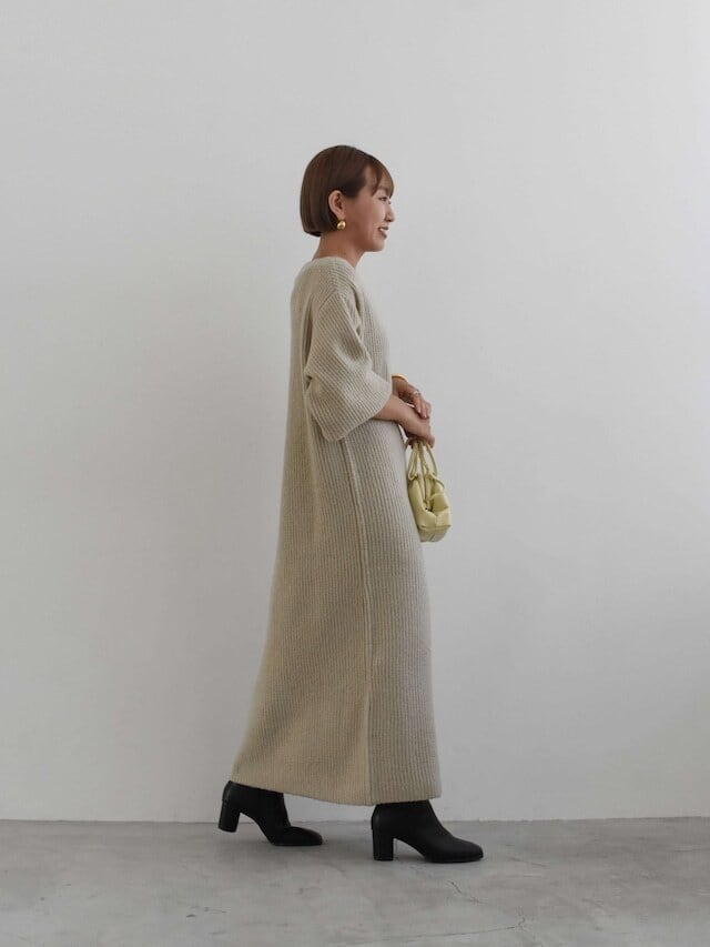 たっぷりとボリュームを持たせたニットワンピースですが手首のリブがきゅっと締めてくれるのでバランスよくお召しいただけます